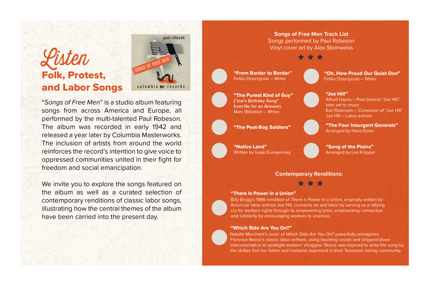 For this exhibition, H2 retrofitted a record player from the 1940s to spin a vinyl alongside an exhibit case featuring a 78 record. Visitors can press a button to hear the various tracks. The songs are lyrical and musical expressions that convey historic issues of labor as it relates to America at work.
