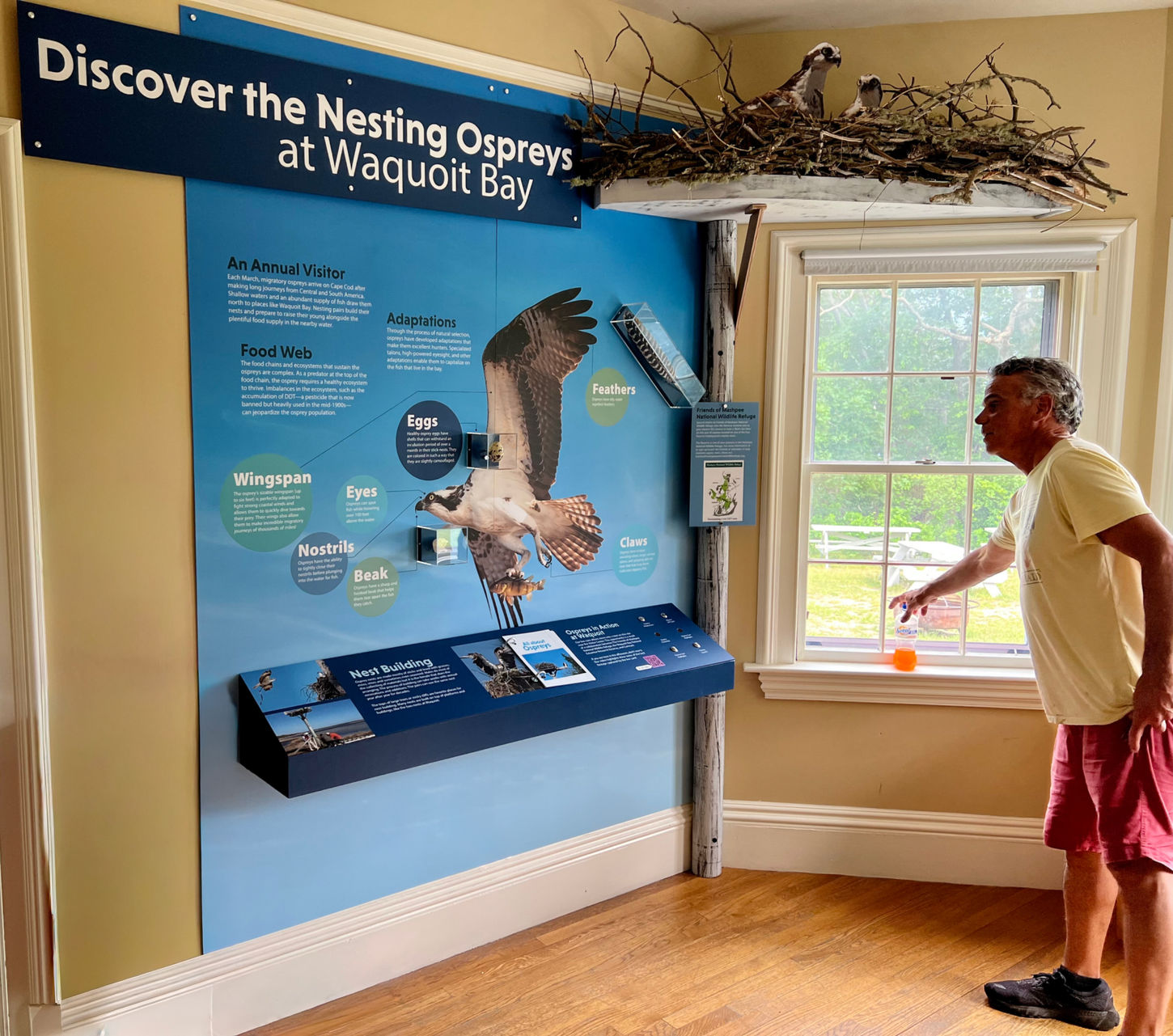 This small yet informative exhibit on the osprey was designed, developed, and installed by H2 Design for the Waquoit Bay National Estuarine Research Reserve. H2 overcame the limitations of the small space and tight budget by creating a compact exhibit that featured a myriad of elements such as layered graphics, multimedia (audio & video), scenic elements like a re-created nest, interactive flip books, and object cases. The exhibit was produced on a design-build contract in our studio and shop.